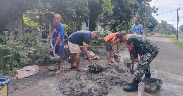 DEMAK - Babinsa Bandungrejo Koramil 12/Mranggen Kodim 0716/Demak Serka Saswito melaksanakan kegiatan Karya Bakti (Karbak) dalam pembuatan gapura di jalan masuk Rt 03 Rw 04 Desa Bandungrejo Kecamatan Mranggen Kabupaten Demak, Senin (12/01/2026).