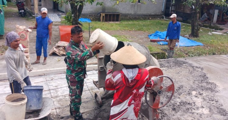 Kehadiran Babinsa tidak hanya untuk memantau kegiatan masyarakat, tetapi juga terjun langsung membantu warga dalam mengoperasikan mesin molen untuk mempercepat proses pengecoran.