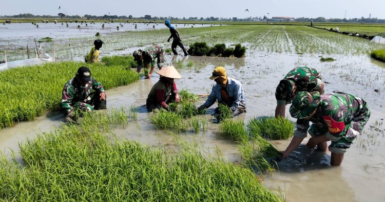DEMAK - Personel Koramil 04/Dempet yang dipimpin langsung oleh Danramil Kapten Inf Irwandi kembali menunjukkan kepeduliannya terhadap warga binaannya dengan membantu mencabut benih padi yang siap tanam di Persawahan Desa Dempet, Kecamatan Dempet, Kabupaten Demak. Jumat (17/10/2025).