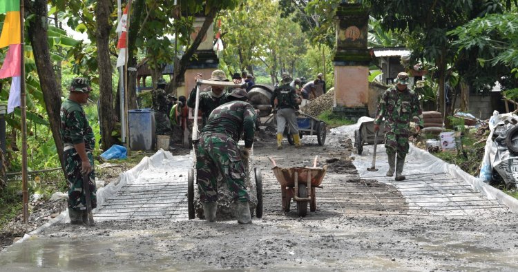 Selama kegiatan pengecoran jalan, prajurit TNI bersama warga masyarakat desa setempat bergotong-royong untuk mempercepat proses pengecoran, sehingga jalan tersebut segera dapat digunakan dan dirasakan hasilnya.
